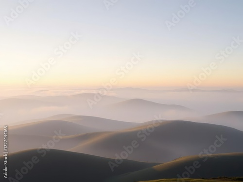 Soft gray mist rises above rolling hills at dawn, cloudy sunrise, peaceful atmosphere, foggy morning