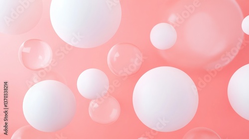 Soft pastel background with white and translucent spheres floating against a gentle coral surface