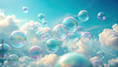 Soft pastel clouds float gently on a light blue background with delicate foam bubbles, resembling whimsical air pockets, as if carried by an invisible breeze, gentle, airy
