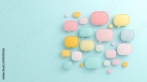 Soft pastel colored speech bubbles of various shapes and sizes floating on a calming minimalist background creating a serene and inviting atmosphere for digital communication and expression