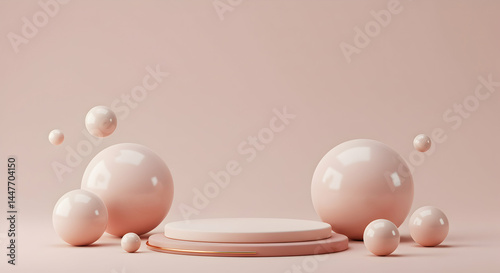 Soft Pink Background with Glossy Spheres and Circular Platform Display