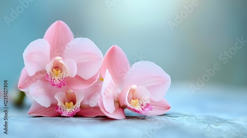 Soft Pink Orchids Resting on a Smooth Blue Surface : Generative AI