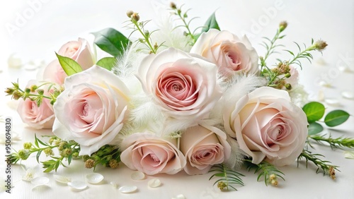 Soft pink roses intertwined with delicate white feathers, surrounded by lush greenery, create a romantic and whimsical still-life arrangement against a creamy white background.