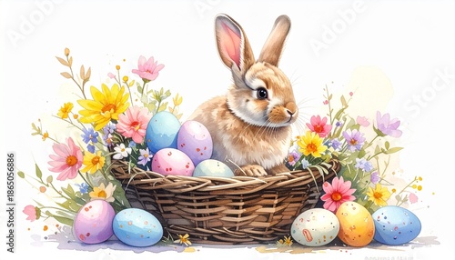 Soft watercolor painting of a cute rabbit sitting in a basket full of Easter eggs and spring flowers, pastel colors, artistic splashes, white background, whimsical and charming style