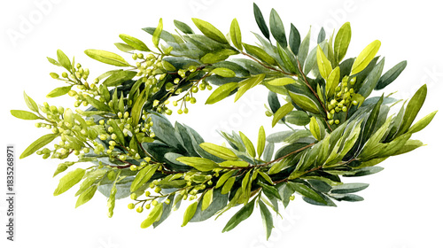 Soft watercolor wreath made of pine and mistletoe isolated on white background