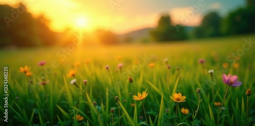 Softly lit blades of grass sway in the warm breeze at dusk, sunset, soft green, flowers