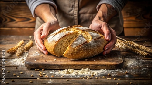Softly lit, golden-brown loaf exposed on a rustic wooden surface with crumbs scattered around, as delicate white bread is gently pulled apart by a pair of hands, artisanal, natural light