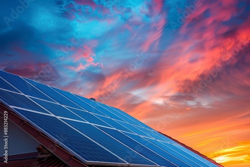 Solar Panels on Roof Against Dramatic Sunset Sky