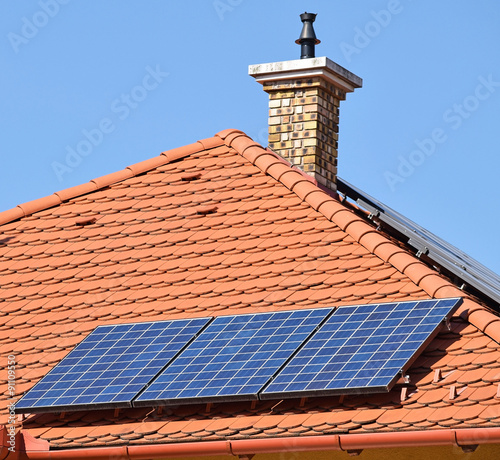 solar, solar energy, building, wall, sky, energy, solar panel, alternative energy, power plant, electricity, energy conservation, technology, roof, in a row, blue, red, chimney, smokestack, diagonal, tree, green, roof tile, eaves, renewable energy, solar cell, house