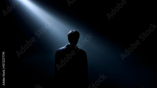 silhouette, beam of light, spotlight, dark, person, shadow, mystery, contemplation, dark background, isolated, alone, sharpened, single, man, figure, illumination, light, contrast, emotion, thought, solitude, introspective, contemplative, solitary, hidden, unknown, uncertain, privacy, profile, back, individual, 1, nobody, abstract, symbol, inspiration, spirituality, meaning, thinking, dream, imagination, potential