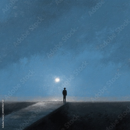solitary, figure, moonlit, path, night, sky, dark, blue, star, light, man, walking, alone, calm, quiet, journey, imagination, mystery, hope, serenity, intrigue, contemplation, thoughtful, visionary, depiction, impressionistic, painting, digital, art, emotional, melancholy, hopeful, huge, horizon, silent, darkness, wanderer, destination, obscurity, stillness, peace, quietude, loneliness, cosmic, spectacle, illumination, perspective, immensity