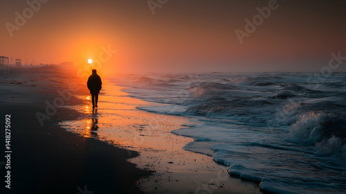 sunrise, sunset, beach, ocean, wave, sea, solitary, figure, person, walking, silhouette, golden hour, calm, peaceful, tranquil, serene, solitude, contemplative, journey, travel, hope, freedom, relaxation, escape, coast, shoreline, sand, water, sky, horizon, daybreak, morning, light, warm, orange, yellow, blue, dark, moody, atmospheric