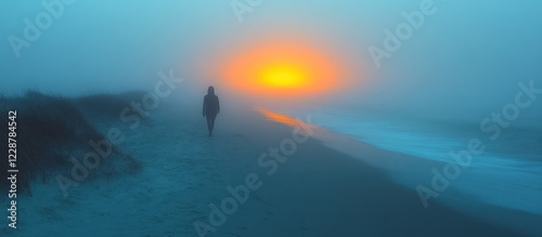 ocean, beach, coast, sea, shore, sand, sunset, sunrise, fog, mist, sky, water, wave, horizon, person, human, walking, silhouette, lone, solitary, path, journey, travel, landscape, nature, view, scene, calm, serene, peaceful, quiet, tranquil, mystery, dreamy, magical, atmosphere, mood, light, colours, blue, orange, yellow, dark, shadow