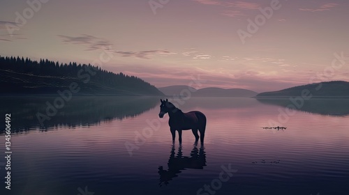 horse, lake, dawn, sunrise, sunset, morning, evening, nature, tranquil, peaceful, serene, quiet, solitude, water, calm, sky, cloud, mountain, forest, tree, scenic, beauty, landscape, wilderness, animal, wildlife, freedom, majestic, solitary, stillness, aethereal, misty, foggy, digital artwork, photo, image, travel, adventure, scenic view, wallpaper, serenity, inspiration