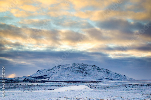 solitary snowy mountain at the end of an icy plain.