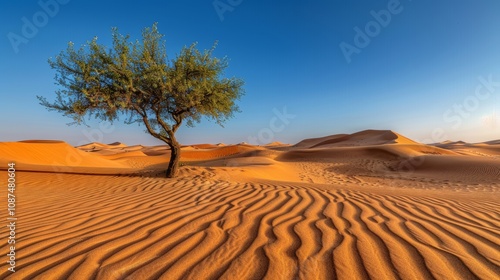 Solitary Tree in Vast Desert Landscape with Rolling Sand Dunes Under Clear Blue Sky