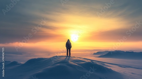 Solitude in Snowy Serenity - Person Contemplating Pale Sun on Dreamlike Hilltop with Soft Light and Vast Sky for Text Placement