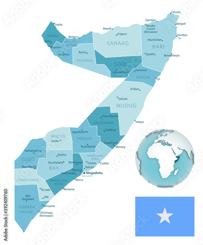 Somalia administrative blue-green map with country flag and location on a globe.