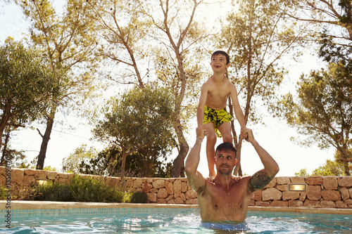 family, holiday, vacation, pool, swimming, outdoors, summer, swimming pool, relaxing, having fun, together, diving, jumping, standing, shoulder, father, eltern, children, children, boy, son, man, young men, villa, spain, ibiza, two people, people, person, man, male, caucasian, 20s, 20s, horizontal, happy, smiling, laughing, surface level, copy space