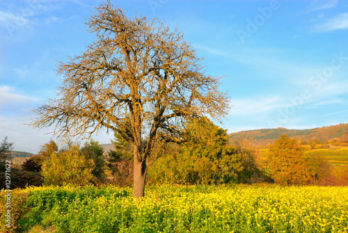tree, autumn, meadow, field, rapeseed, countryside, idyl, countryside, broadleaf tree, fruit tree, grass, hay, environment, season, twig, bald, log, hill, fall foliage, sunny, blue, green, flower, flower, nature, farming, pretty, idylli, peaceful, calm, health, natural, countryside