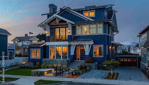 sophisticated, craftsman, style, new, construction, sapphire, blue, house, modern, streamlined, architecture, picturesque, coastal, town, suburban, residential, estate, exterior, luxury, property, building, roof, yard, contemporary, luxurious, expensive, neighbourhood, country, facades, twilight, new house, residence, real, suburb, entrance, garage, traditional, view, architectural, evening