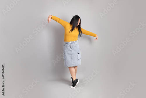 woman, person, overweight, adult, female, isolated, asian, portrait, southeast, studio, thai, beautiful, full-length, young, full body, casual attire, grey, yellow, cheerful, smile, happy, attractive, fashion, standing, cute, lifestyle, confident, positive
