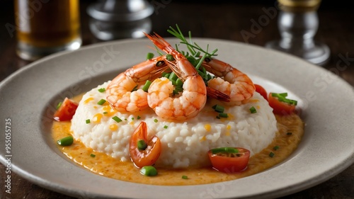 southern comfort foods shrimp and grits isolated on an aesthetic plate, concept for advertisement