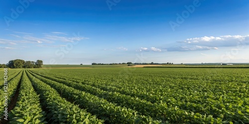 Soybean fields stretching as far as the eye can see under the warmth of a clear blue summer sky with no clouds in sight, landscape, countryside, farming practices, vast fields