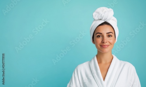 copy, space, banner, spa, wellness, woman, bathrobe, towel, relaxation, skincare, beauty, calm, rejuvenation, hygiene, freshness, peaceful, bodycare, comfort, lifestyle, healthy lifestyle, beauty care, mindfulness, purity, soothing, pampering, cleanliness, blue background, simplicity, well-being, smiling