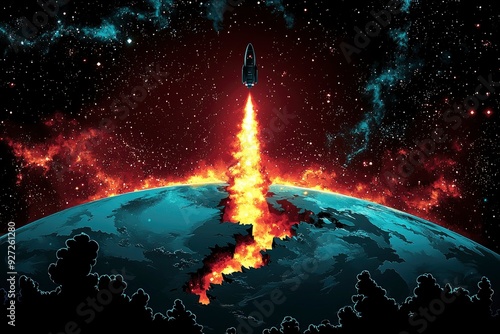 spaceship, crash, earth, flames, fire, destruction, apocalypse, disaster, end of the world, burning, planet, space, star, galaxy, cosmos, universe, sky, night, dark, dramatic, apocalyptic, catastrophy, science fiction, fantasy, illustration, artwork, digital artwork, abstract, surreal, future, imagination, hope, despair, tragedy, fear, danger, warning