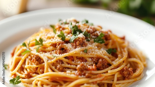 Spaghetti bolognese sauce featuring a mix of meat cheese tomatoes and spices served on a white plate
