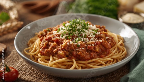 Spaghetti served with a vegetarian ragout, rich in fiber, healthy option