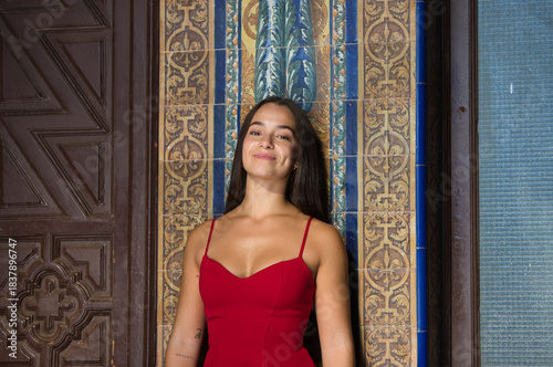 Spanish woman, with long dark hair, young and pretty, dressed in red, sitting leaning against the tiled wall of the Plaza de España in Seville, Spain. The woman is smiling and happy.