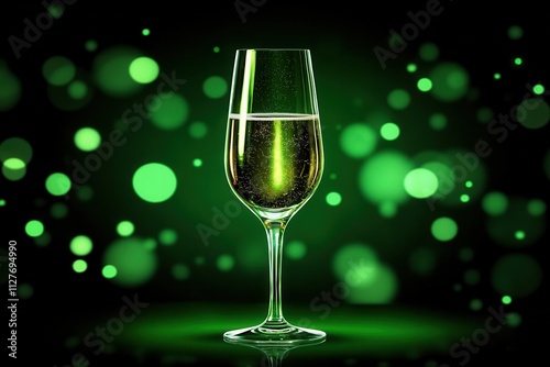 Sparkling drink in an elegant glass against a vibrant green bokeh background