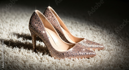 Sparkly heels on soft rug with shimmering details and elegant design showcase. Sparkly heels perfectly accentuate style on plush rug for fashion enthusiasts.
