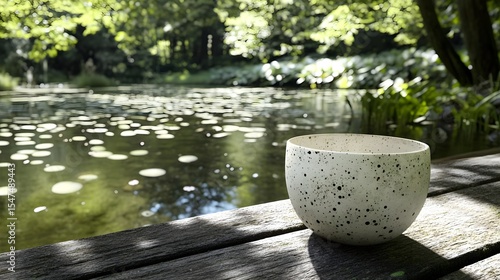 Speckled Ceramic Bowl by a Pond, speckled bowl, white bowl, black speckles, pottery, water