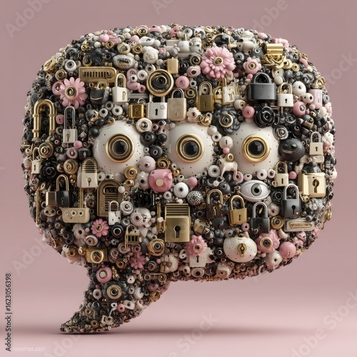 speech, bubble, lock, gear, security, privacy, communication, mechanical, surreal, abstract, pastel, metallic, design, concept, eye, symbol, creative, secure, network, conversation, idea, visual, artistic, macro, detailed, pattern, texture, part, message, dialogue, expression, metaphor, structure, shape, style, icon, safety, closed, datum, cyber