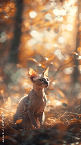 Sphynx cat in a sunlit autumn forest, tranquil outdoor scene. Pet and nature photography concept