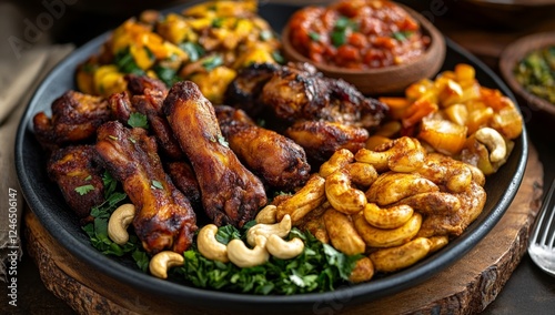 Spicy chicken, cashew, vegetable platter, African cuisine, food photography, restaurant menu