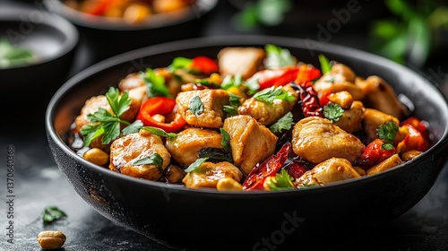 chicken, cashew, spicey, food, dish, bowl, stir fry, dinner, meal, receipe, cooking, eatery, lunch, healthy, cookery, plate, roasted, sauce, oriental, asian, delicious, favor, alimentary, protein, dinnerware, crockery, home cooking, picnic, vegetarian, vegan, dining, appetence, taste, chef, fresh, colourful, seasoning, chili, pepper