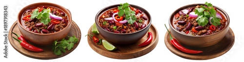 Spicy chili con carne with beans, vegetables, onion, and herbs in ceramic bowl on wooden tray with chili and lime isolated on white background