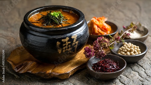 korean, cookery, spicey, soup, kimchi, stew, traditional, food, asian, dish, healthy, meal, ceramic, bowl, rustic, setting, wooden, board, stone, table, fresh, ingredient, epicure, cooking, delicious, favor, savoury, taste, hot, pot, comfort, authentic, receipe, culinary, art, photo, studio, shot, dark, background, vibrant, colours, rich, texture, hearty