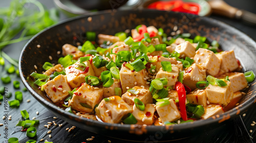 Spicy Mapo Tofu with Green Onions and Sesame Seeds - Food Photography