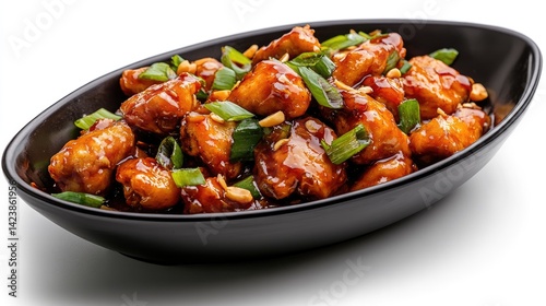 Spicy Sichuan kung pao chicken with peanuts on an ideal white background.
