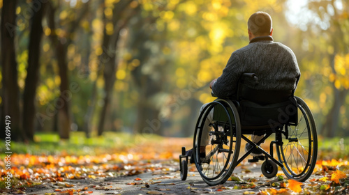 Spina Bifida Awareness Month. Disabled person with spina bifida in the park. Man in wheelchair on yellow background. Horizontal banner, free space for text. Neural Tube Defect, birth defect