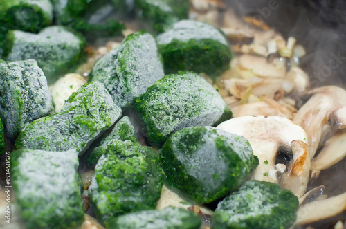 spinach, mushroom, dish, dinner, food, lunch, vegetarian, vegan, health, muscular, background, foliage, vegetal, cook, garlic, onion, glacé, steam, frying pan