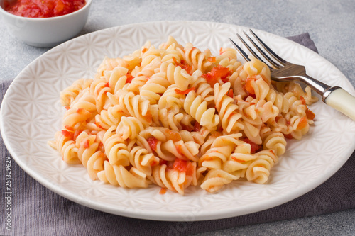 Spiral pasta mixed with cherry tomatoes and tomato sauce on a plate.
