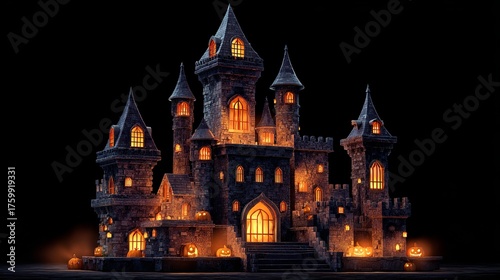 castle, skittish, halloween, dark, night, ominous, haunted, mysterious, eerie, creepy, gothic, stone, tower, window, glowing, light, orange, pumpkin, smoke, fog, shadow, silhouette, ancient, mediaeval, fortress, architecture, structure, building, dwelling, residence, estate, manor, luxury home, abode, domicile, habitation, property, ground, exterior, facades, entrance, doorway, portal, threshold, entranceway, approach, pathway, ascent