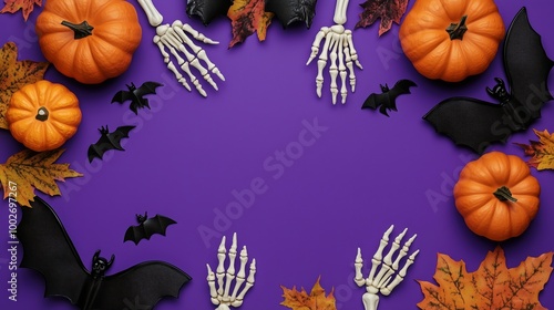 Spooky Halloween flat lay with pumpkins, bats, and skeleton hands on purple background, top view composition for holiday decorations. Festive Halloween design with dark colors and space for text, perf
