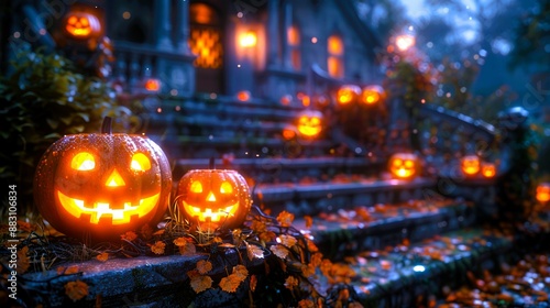 Spooky Halloween pumpkins illuminate a dimly lit porch.